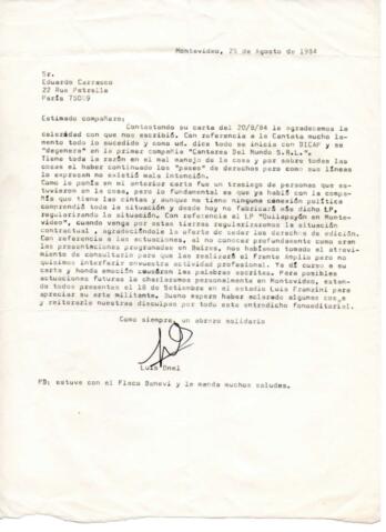 Carta de Luis Onel a Eduardo Carrasco agradeciendo pronta respuesta.
